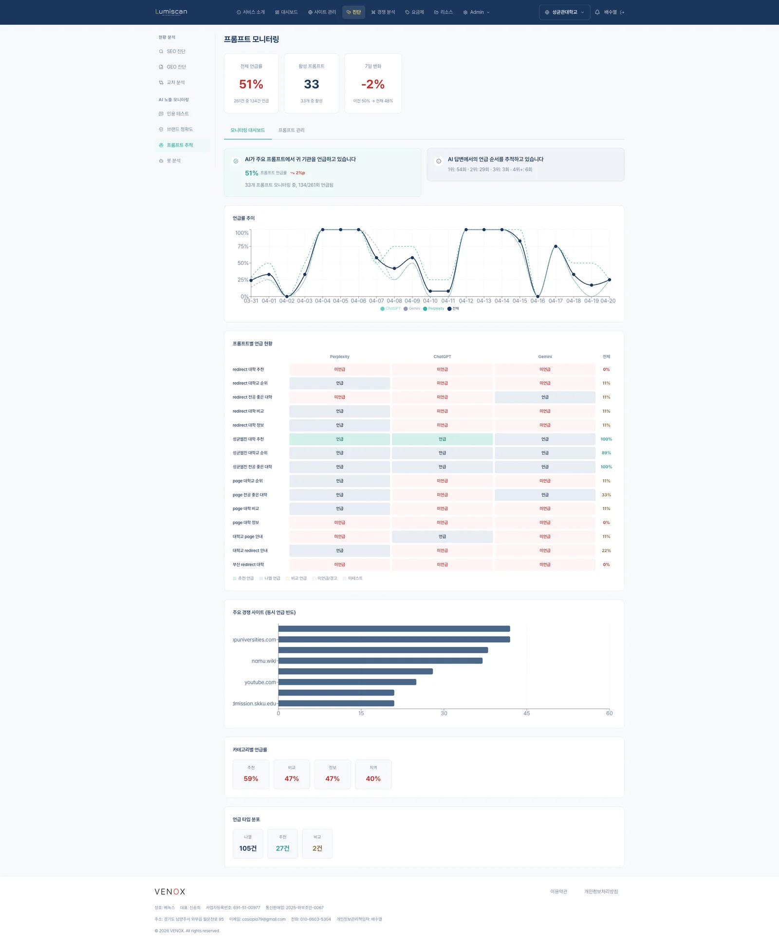 "성균관대학교 수시 전형" 같은 정보성 쿼리와 "서울 소재 경영학 좋은 대학" 같은 의사결정 쿼리를 동시에 추적한다. 의사결정 쿼리에서 언급률이 하락하면, 해당 영역의 콘텐츠가 경쟁 출처(topuniversities.com, 나무위키)에 밀리고 있다는 신호다. 루미스캔의 프롬프트 모니터링은 이 하락을 7일 변화율로 포착해 알림을 보낸다.