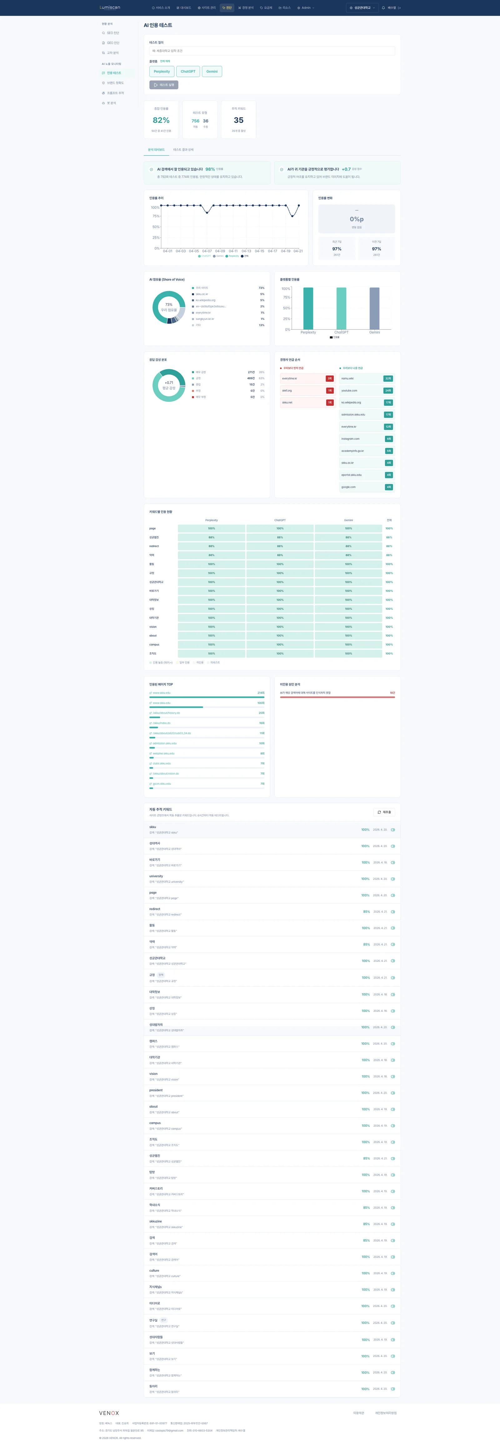 성균관대학교 공식 사이트는 ChatGPT, Perplexity, Gemini 세 주요 AI 검색 엔진에서 100% 인용률을 기록하고 있다. Share of Voice 기준 73%의 점유율로, AI가 "성균관대학교"를 언급할 때 공식 사이트가 사실상 독점하고 있다고 해도 과언이 아니다.